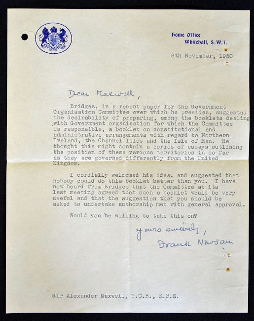 Hand Signed Sir Frank Newsom typewritten letter to Sir Alexander Maxwell on Home Office letterhead dated 8th November 1950 having interesting content discussing the government organisation and administrative arrangements in regards to Northern Ireland the Channel Islands and Isle of Mann, outlining various territories in so far as they are governed differently from the United Kingdom, clean and good example. Note: Sir Frank Aubrey Newsom died in 1964 and was a British Civil servant notable for serving as Permanent Under-Secretary of State to the Home Office from 1948-1957. In 1948 it was announced Sir Alexander Maxwell was to retire and Newsom had been appointed to follow him as Permanent Secretary to the Home Office