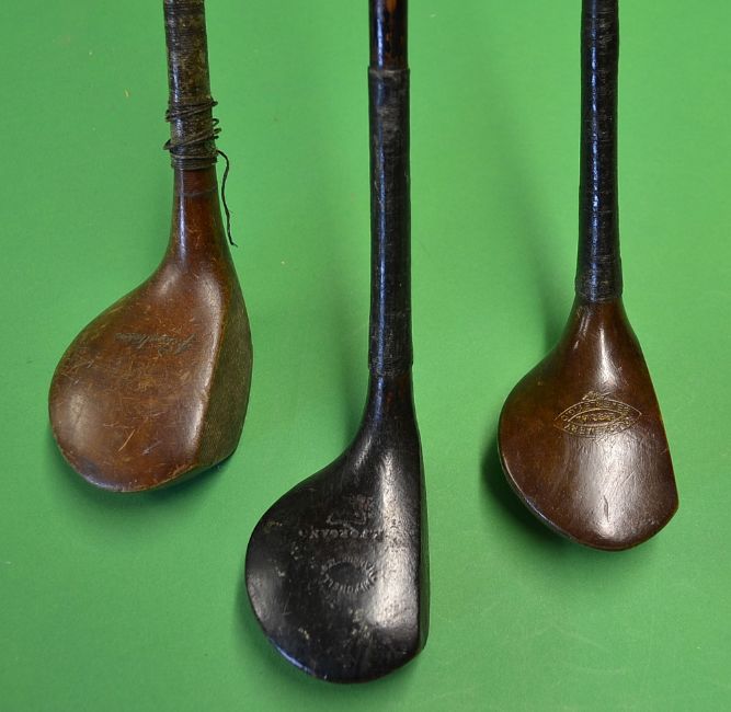 3x good late scare neck woods to incl R Forgan Crown stamped driver, a decoratively stamped C Drewery brass plated brassie and J Tomlinson light stained persimmon driver - all fitted with original full length grips