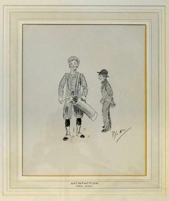 May, (Phil) Philip,William RI (1864 - 1903) TWO GOLFING CARTOONS - pen and ink on paper - both signed and bearing gallery labels verso for W Russell Button, Chicago - images measure 9.5"x 7.75" and 6.5"x 10" and titled "Satisfaction" and "Disputation" - overall 16.5 x 14.25". Note: Phil May was an illustrator. He was born at Leeds where he started his career as a scene painter at the Grand Theatre. He worked in Australia on the Sydney Bulletin 1885-88 and returned to England and became a successful black and white artist. He contributed to The Graphic from 1890 and to Punch from 1893. He was a member of the New English Art Club and the Royal Institute of Painters in Watercolours. May also worked in France, Italy and America. Several of his works are in the Tate Gallery.