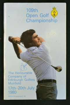 1980 Open Golf Championship programme signed by Seve Ballesteros - played at Muirfield and signed by Ballesteros to the cover as defending champion from 1979 - overall (VG)