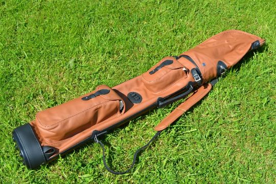 Fine and new "The Laird" full leather golf bag - made in England - oval shaped with 3x partitions c/w travel hood, fully lined, two good different size side pockets, leather padded shoulder strap - unused overall 35"x 6" x4"#