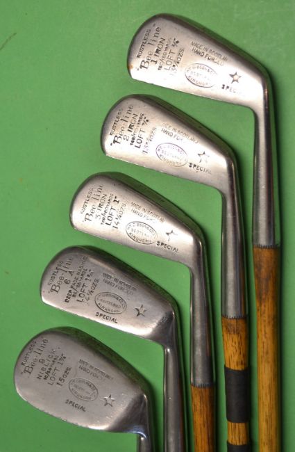 Set of 5x 'Bee-Line' matching irons to include a 1, 2 & 3 iron, a 6 iron and 9 iron (niblick with a bowed shaft) all showing the Gibson Kinghorn mark both to the head and shaft below the full length leather grips - perfect for playing