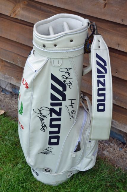 1987 Bells Scottish Open Golf Championship Signed Mizuno leather golf bag - played at Gleneagles and signed by the winner Ian Woosnam and Runner Up Peter Senior, plus Open Champions Seve Ballesteros, Tom Kite, Fred Couples, together with Sam Torrance, Rodger Davies, Anders Forsbrand and Ollie Moore (VG) Note Alan Callan, founder and Chairman of The Bell's Scottish Open from 1986 to 1994 - British businessman, record producer and music executive. He worked as an executive for Swan Song Records (a record label established by English rock band Led Zeppelin in 1974), as a business manager for Jimmy Page who sadly died in 2014