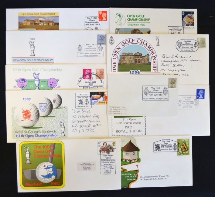 Collection of Golf Open Championship postal covers from 1980 - 1989 (10) to incl Muirfield 1980, Royal St George's 1981, Royal Troon 1982, Royal Birkdale 1983, St Andrews 1984, 2x Royal St George's 1985, Muirfield 1987, Royal Lytham 1988, and Royal Troon 1989