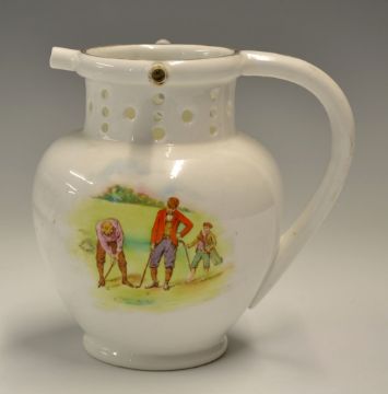 Rare Foley China Co, golfing decorated large "Puzzle" jug c1920 - decorated with colour transfer golfing scene with a golfer and his caddie - the jug features selection of perforations around the top (the puzzle is how to pour?) - base with printed makers details and Rd No 360460 - overall 6.25"h (G)