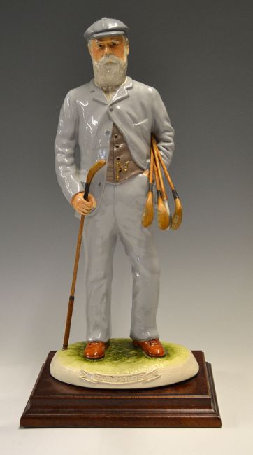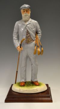 Tom Morris - large full length bone china figure of Old Tom Morris holding various period handmade longnose clubs and iron - by Bill Waugh ltd ed no 77 c/w signature on the base - mounted on an dark stained oval wooden base - overall 16"