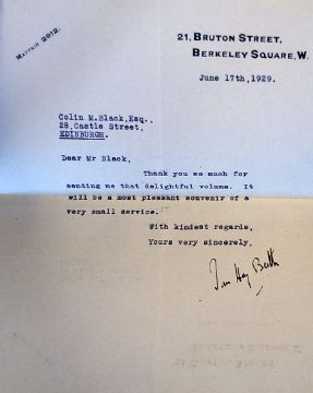 Very rare set of 1929 Open Golf Championship bound programmes and original handwritten manuscripts - played at Muirfield and comprises a complete set of 5 programmes issued on the Monday, Tuesday, Wednesday (1st Rnd), Thursday ( 2nd Rnd) and Friday (final two rounds) and includes all the pairing sheets for each day and printed results. Each programme has an appeal for the local Children's Hospital, two of which were written by Ian Hay, two by John Buchan and one - the final day - by Bernard Darwin. The compiler of these programmes retained the original manuscripts from the three contributors, as well as their notes of thanks signed by all three but Bernard Darwin's signature has been cut from the end of his contribution otherwise fine. The programmes complete with their covers and the manuscript material are all bound together in a quarter leather / red cloth binding - quite remarkable collection and in such good overall condition to incl illustrations from the Life Association of Scotland Calendars by Michael Brown, numerous golfing advertisements et al overall (VG) Note: This was the first year that the R&A produced an official programme