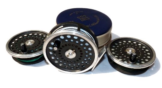 REEL & SPOOLS: (3) Hardy Marquis 8/9 alloy trout fly reel in fine condition, black handle, U shaped line guide, backplate drag adjuster, c/w 2 spare spools, all fitted with lines and one hardy zip case.