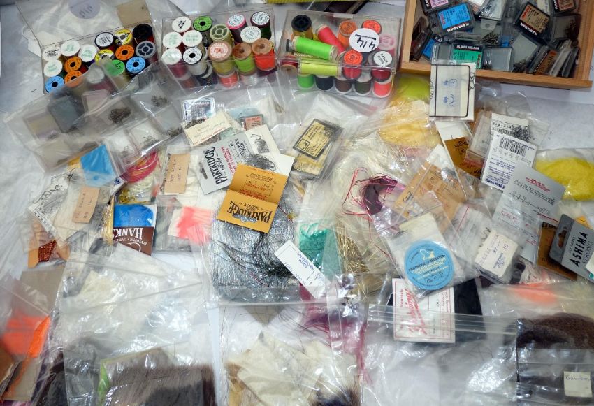 FLY TYING: Large collection of trout fly tying materials incl. many hooks by Mustad, Partridge, Drennan and Kamasan in original packets, spools of threads, floss fluro material etc. plus feathers and tying material by Veniard and others.