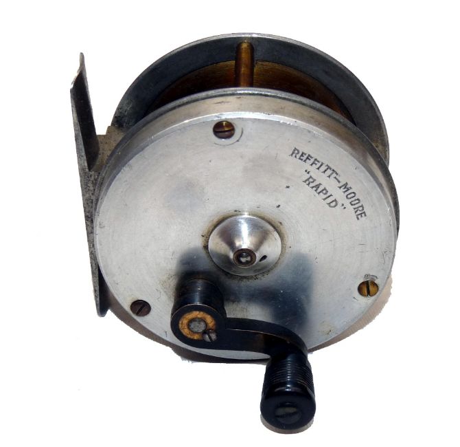 REEL: Fine and rare Reffitt-Moore Rapid alloy geared multiplier reel, 2.6" diameter casing, curved bronze crank arm with turned ebonised handle, three brass pillars with original screws, brass deep drum, correct smooth alloy foot, in little used condition, retains good lacquer to all parts, fully working example in the finest collector condition, c1905. NOTE: Often stamped J E Miller of Leeds, these reels were available in brass and alloy.