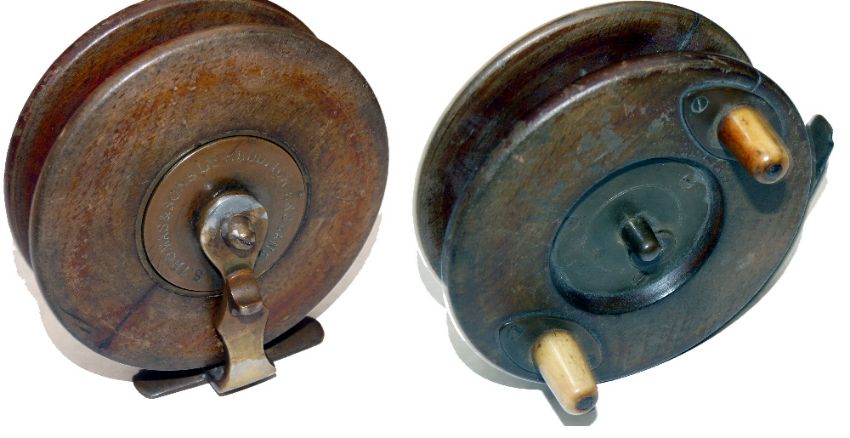 REEL: S Thomas & Son Redditch England wood and brass reel, 4.25" diameter, twin horn handles on brass eye plates, Slater style quick release drum, shaped rear stanchion with crass disc stamped S Thomas & Sons Ltd, Redditch England, on off check button, central spindle screw, rarely seen pattern.