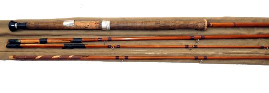ROD: JS Sharpe of Aberdeen 12' 3 piece with correct spare tip, spliced joint salmon fly rod, and impregnated cane, burgundy whipped low bridge guides, splice joint pegs, 19" cork handle with light alloy reel fittings, fine, in MOB.
