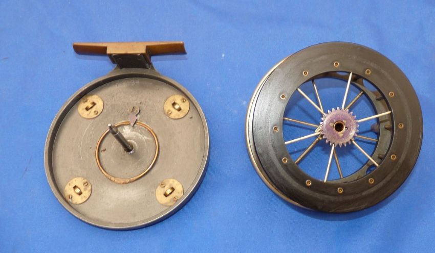 REEL: Scarce Allcock roller back Aerial Centrepin reel, 4.5" diameter, 8 large ventilations to front plate with German silver rim, crazed bottled handles, 6 spoke with tension regulator, 1 1/16" between plates, ebonite rear flange, 4 genuine original brass rollers recessed to backplate, internally stamped "23551", correct smooth brass foot, brass on/off check button to internal copper calliper spring, retains good dark lead finish to backplate, spins well with no roller contact, one of the finest examples we've seen.