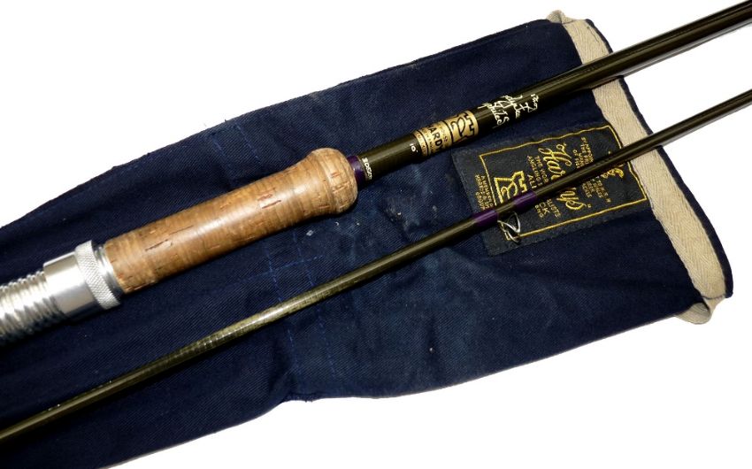 ROD: Hardy Favourite Graphite Spin rod 10' 2 pce, grey blank, purple whipped guides, cork handle, alloy screw reel fitting casting weight 1.75 oz. good used condition, in MOB.