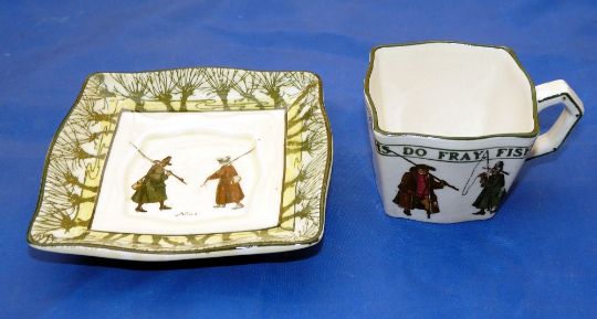PORCELAIN: Isaac Walton ware 3" square cup and matching 5.25" dia. saucer, both with anglers by Noke, cup legend "none do here use to swear oaths do fray fish away".