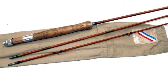 ROD: Pezon et Michel Parabolic Sawyer Nymph 8'4" 2 piece with additional spare tip (repair to top), burgundy whipped snake guides, bronze ferrules, cork handle with light alloy screw winch fitting, spare tip guides whipped green, a/f, in MOB.