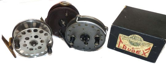 REELS: (3) Fine JW Young Trudex 4" alloy trotting reel, grey bobble finish, black handles and hub boss, retains virtually all original finish, with packing in MOB, an Allcock Aerialite 3.75" Bakelite trotting reel, wire line guide, on/off check and a Grice & young brass/stainless Centrepin reel, 3.75" diameter, on/off check, replacement front nut.