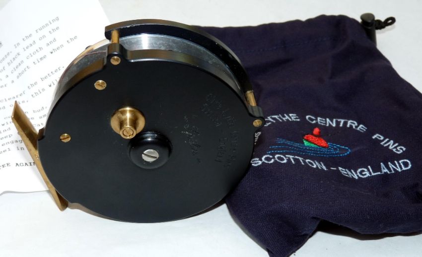 REEL: Chris Lythe Centrepin The Spitfire Aerial match reel, 4" polished drum, 6 spoke with tension regulator, twin black handles, alloy line guide on brass pillars, black anodised backplate, on/off check, correct brass foot, mint condition, c/w care instructions and maker's logo bag. NOTE: Current waiting list is 4 years plus for this reel.