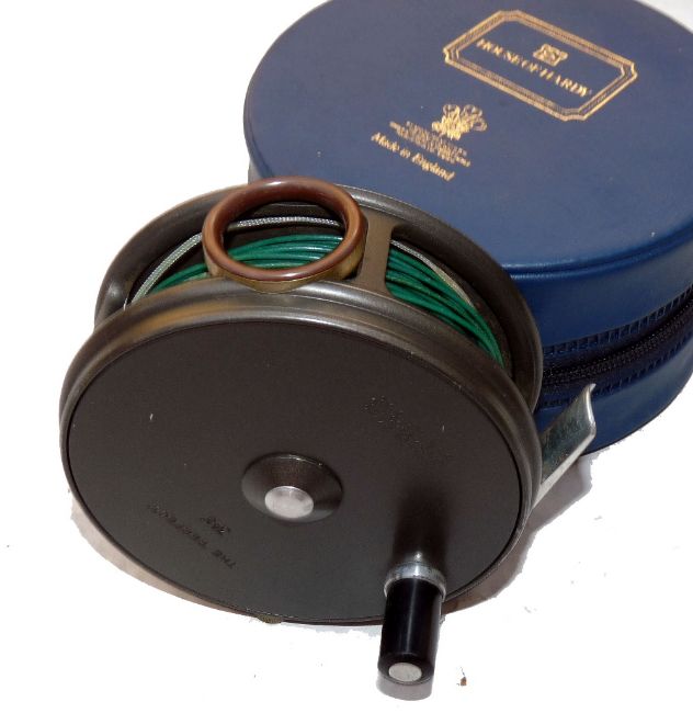 REEL: Hardy Perfect LHW 3 5/8" alloy trout fly reel, late model, black handle, rim tension regulator, smooth alloy foot, brown agate line guide, retaining most original finish, c/w fly line in maker's zip padded case.