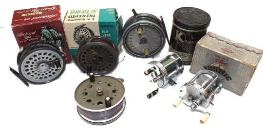 REELS: (6) Allcock Patent 4" Easicast drum spinning reel, line brake and lever check arm, twin ivorine handles, an Intrepid Gearfly reel c/w instruction, in MOB, an Intrepid lightweight fly reel in MOB, a Strike Right 3.5" pressed alloy Centrepin reel, a Kalamazoo American Boy 1706 nickel plated bait casing multiplier with level wind, in maker's tin and The Nordic Beresford No.45 bait casting reel with level wind, in MOB, good selection.