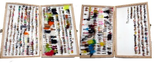1000 FLIES & BOX: Collection of 1000 new shop stock trout flies, all patterns and sizes from buzzers, nymphs to lures, see images for detail, all in a 3 layer wood reservoir box, 14" x9" x3".
