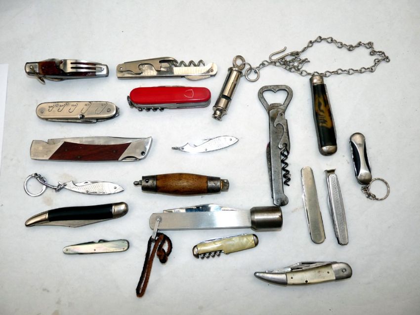 ANGLERS KNIVES: (Qty) Collection of classic angling knives incl. a multi blade example with hook scale and measure to side plates, various metal and horn side plates, spork, Swiss Army knife multi-tool, see image for full content.
