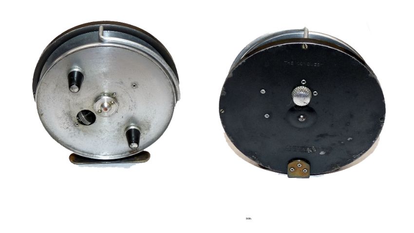 REEL: Hardy The Conquest 4" alloy narrow drum centre pin reel, twin black handles, face plate tension adjuster, correct smooth brass foot, alloy line guide, on off ratchet knob, retains most grey enamel finish, spins well.