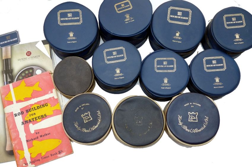 ACCESSORIES: (Qty) Eleven Hardy zip padded reel cases in trout/salmon sizes, 7 x modern and 4 x vintage cases, 2 x recent Hardy catalogues and Walker, R - "Rod Building For amateurs" 2nd ed 1963.