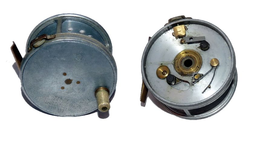 REEL: C Farlow & Co London patent 3398 alloy wide drum salmon fly reel, 3.5" wide drum Perfect pattern, ivorine crazed white handle, smooth check, rim tension regulator, correct 4 screw brass foot, internal Patent moving check assembly, good.