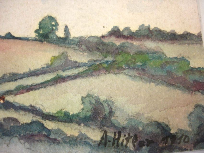Attributed to Adolf Hitler 1889-1945 An extensive landscape. Bears a signature and date 1910. Watercolour and pencil on paper 2 ¾"x 14" Unframed. Prov: We are informed by the vendor that this was one of several works liberated by Company Sgt. Maj. W (Willie) J. McKenna, the Manchester Regt. when he was stationed in Essen, Germany in 1945. This work formed part of his estate. Condition report: Good, slight foxing to the sky, centre fold
