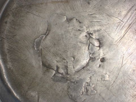 A Pewter Deep Dish Continental, probably Dutch. With cast rim, the well decorated in wrigglework with a realistically observed ostrich running in a landscape, the cavetto with wavy lines and initials "GH" and date "1707" in a cartouche. Verso: No bouge hammering or evidence of a touch mark. 8 ¾" diam. Condition report: Repair to well, minor crack to the bouge and cavetto, small loss to the rim, surface scratches