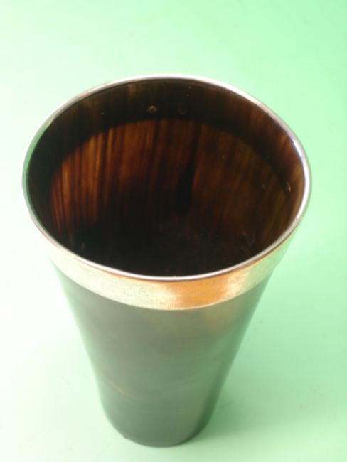 An Edwardian Horn Beaker With silver mounted rim and applied vacant shield cartouche. 5 ¾" high. London 1901. Condition report: All good, no splits, tiny chip to base