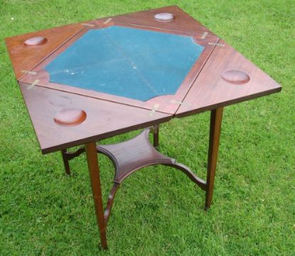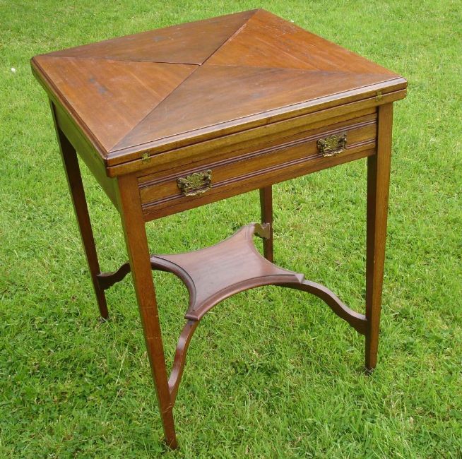 An Edwardian Mahogany Card Table The envelope top over a channel moulded frieze drawer, raised on square tapered legs united by an undertier. 22" wide. Condition report: Slightly wide gaps to envelope quarters, green baize playing surface faded and worn, otherwise good