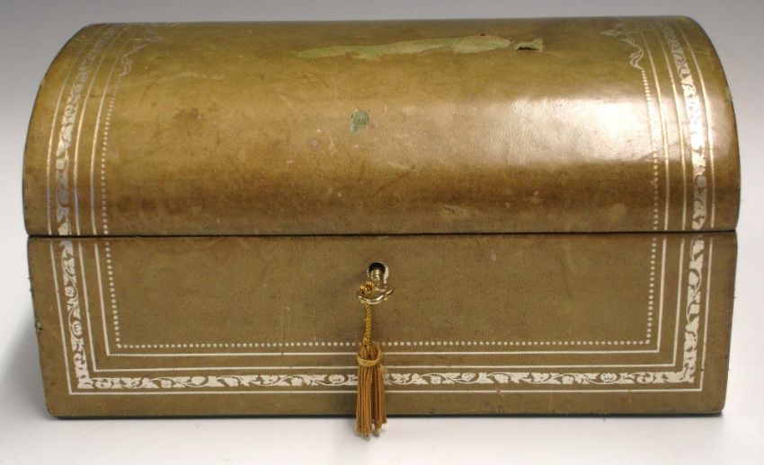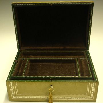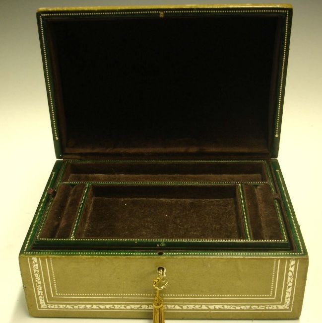 Francoise Dior Collection Her leather jewellery box containing a pair of her SS gilt metal earrings, a Luftwaffe type brooch set with rhinestones, an 800 silver England Awake brooch and the original receipt for the purchase of the box, signed verso by Otto Skorkenzy, Hans Rudel and Karl Woolf whom she met that day in Austria with other leading figures in the Odessa Organisation which was financed by Dior during the 1950s. Prov: The estate of Mrs Alice Fenner, Dior's housekeeper during her marriage to Colin Jordan in England. Condition report: Lid of box is sunlight faded with areas of loss to surface, age related scratches and scuffing, small red ink stain. Earrings with some deterioration to the enamel. Otherwise all good