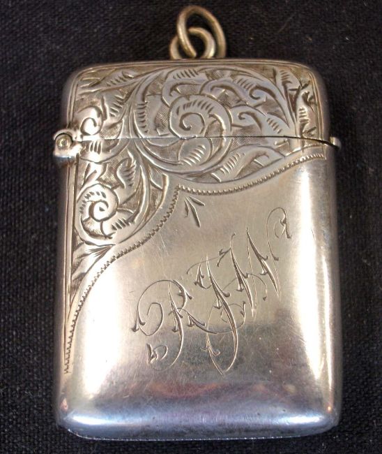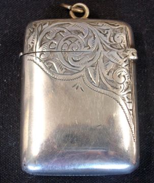 A Silver Vesta Case Of cushion form, engraved with foliage and initials RJW. 2" high. Birmingham 1876. Condition report: Small dent under hinge