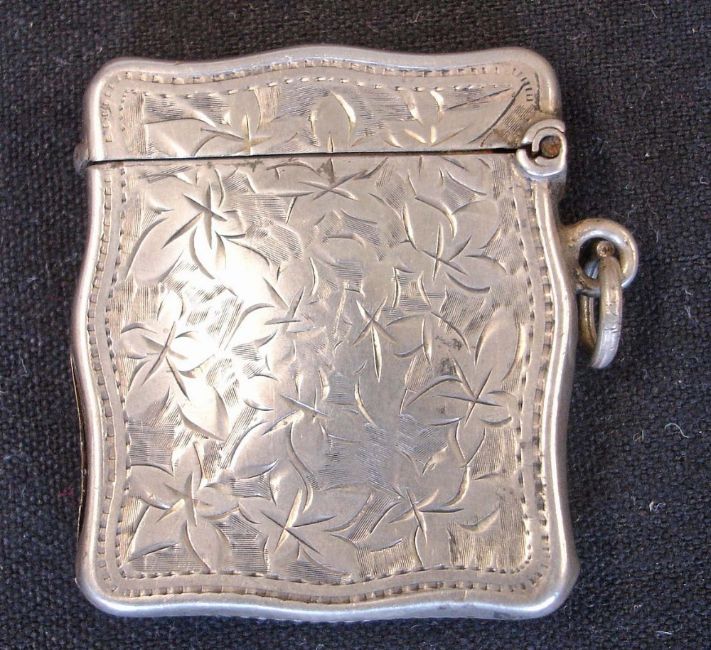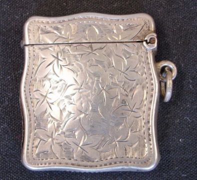 A Silver Vesta Case Of shaped form and engraved with leaves and initials to a cartouche. 1 ¼" high. Birmingham 1907. Condition report: Split to seam, dents