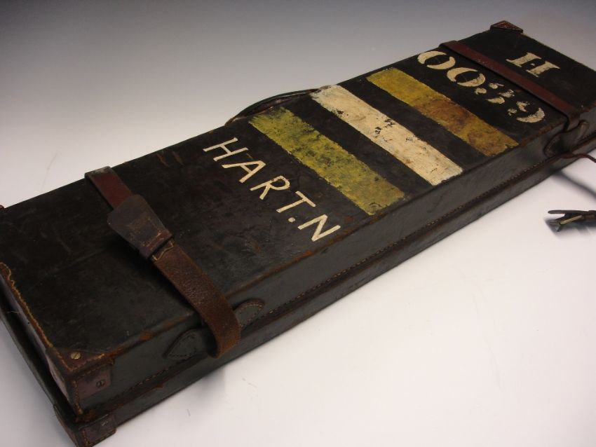 A Great War Leather Gun Case The top impressed "Captain M.M. Morris R.A" Bears label for Atkin, Grant and Lang Ltd, St James's, London. 32" wide. Condition report: Leather is good, numbers and name on base in white paint. Interior complete but soiled