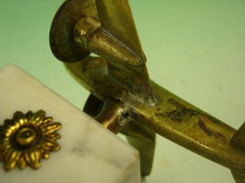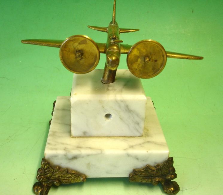 Trench Art A brass model of a WW2 aircraft. Mounted on an associated stepped marble base. Length of fuselage 4 ¼". Condition report: Wing re-soldered, one patera mount lacking from base