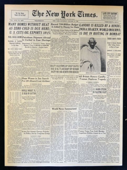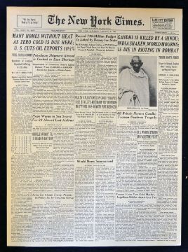 India Gandhi Shot Dead New York Times 1948 Newspaper article 'Gandhi is killed by a Hindu: India shaken, world Mourns. January 31st, overall 26.5 x 37cm, a clean example