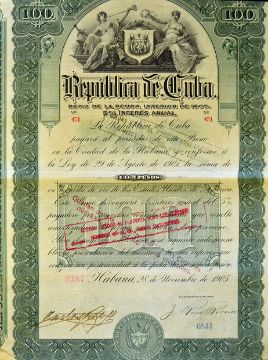 Cuba Bond Certificates Republic of Cuba 1905 5% interest $100 'Republica de Cuba' 'Bono', all stamped and signed in Green with highly detailed vignettes, some folding, but good for age and in clean condition, overall size 26.5 x 35cm (4)