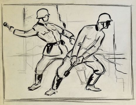 WWII related original artwork Roman Zenzinger Grenade Thrower in pencil on paper title in pencil to bottom left hand corner and signed 'Zenzinger' to bottom right hand corner. Fine portrait of a German soldier about to throw a stick grenade with preliminary sketch to top right hand corner. With two further outline sketches in black ink and pencil respectively to verso showing two German soldiers about to release stick grenades. Overall dimensions 45 x 62cm in good clean condition