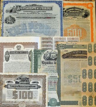 Cuba Share Certificates A selection of consisting of shares from $100-$500 to include Association Canaria, Ingenio Australia Sugar Company, Cervecera Company (Brewery) x2, Repbulica de Cuba 1905, Sindicato Minero Asiento Viejo Mining Company, interesting Ayuntamiento de la Habana Cien Pesos certificate and a Copmania Consolidada de Ferro-Carriles $100 certificate (damaged), all with highly detailed vignettes, in various colours, most in good clean condition some with markings, overall good examples, sizes vary (8)