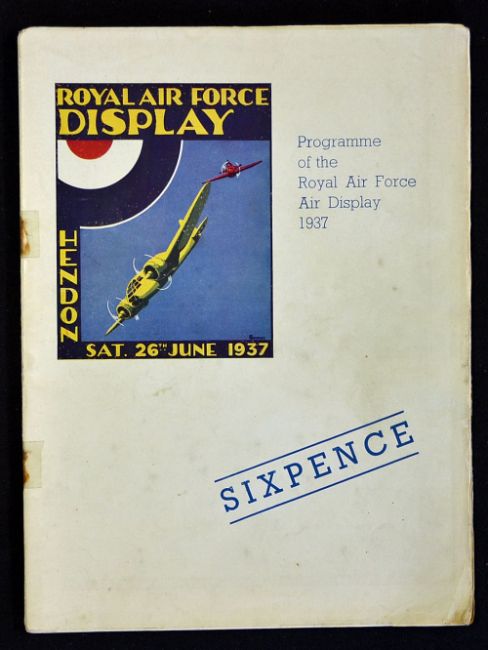 Aviation Royal Air Force Display 1937 Illustrated Souvenir Programme Hendon, nicely illustrated souvenir programme of 96 pages full of photographs and detailing the various events, also some full colour illustrations including the then new aircraft such as the Spitfire, as well interesting period illustrated advertising by the different manufacturers. Well printed on fine gloss paper in multi-coloured cover, size 18.5 x 25cm, in good condition