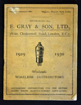Trade Catalogue E. Gray & Son Ltd Wholesale Wireless (Radio) Distributors 1929/30 at 18-20, Clerkenwell Road, London. An extensive 46-page trade catalogue illustrating and detailing with prices 18 different Radio Receivers including the notable Pye Art Deco Sun shine Receiver for £23.10s.0d and an all electric Radiogram for £55. Plus many other components and accessories etc. Printed on semi-gloss paper in illustrated card cover, size 19 x 25cm, with minor wear marks, otherwise generally good