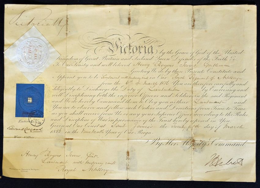 Royal Artillery Commission 1857 signed by 'Queen Victoria" made out to Henry Rogers Ievers (1834-1864) Born Rasbarkin, Antrim, Ireland, School Christ's Hospital was at Magdalene College Cambridge in 1853, Lieut., Royal Artillery. Died 1864 at sea coming home from Ceylon. A large part of the Royal Artillery was in the Crimea in the War there at this time, in black print with red ink, some heavy folds and wear otherwise in clean condition, 36 x 25cm