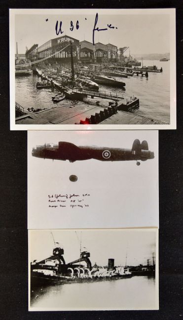 Aviation WWII Walter Morrison signed postcard 103 Squadron RAF signed in blue ink to the front, a photograph of Fl Lt T Bennett and G Fawke G17 Squadron 1944 in front of their Mosquito in which they carried out low level dive bombing marking of targets for the Lancaster Bombers, a photograph Enemy Bombs in Norfolk, maidens looking for bomb souvenirs dated 1940, a print of a Lancaster bomber dropping a bomb dated 1943, a British Official Photograph 2nd British Naval action off Narvik on April 1940, and Brighton 1933 Bombed and sunk in Dieppe Harbour 1940 and another photograph of a Krupp port for U Boats with 'U36' to front in pen signed by Gerd Schreiber, all in clean condition (8)