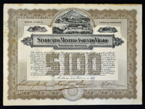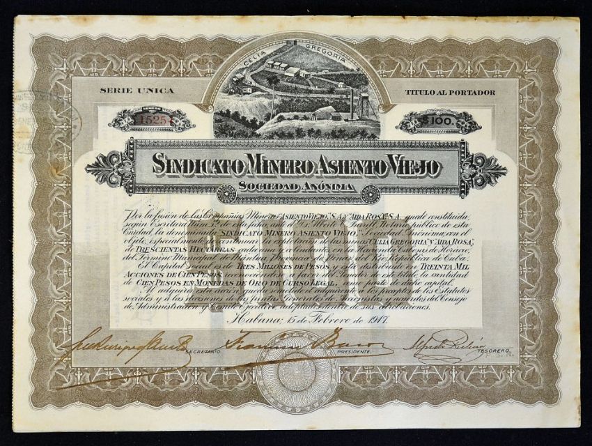 Cuba Share Certificates Sindicato Minero Asiento Viejo Mining Company 1917 $100 dated 15th February, in brown, with highly detailed vignette, stamped and signed, overall size 30 x 22cm, all in good condition (4)