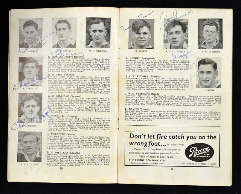 Rare 1955 Wales (Champions) v Ireland signed rugby programme - signed by the Welsh team to their player profiles and signed by the Irish to the centre page team line-up - usual pocket fold, some marks, otherwise overall (F/G)