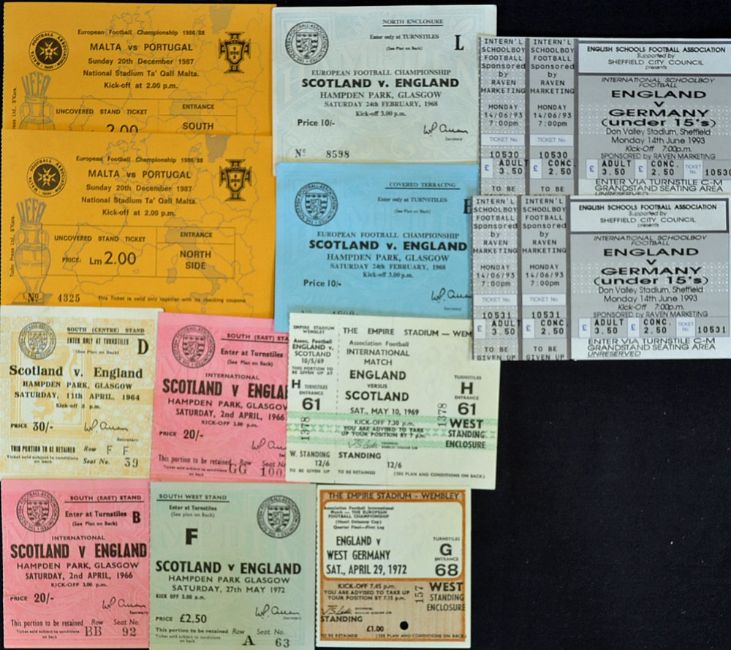 Collection of International match tickets including Scotland v England 1964, 1966 x 2, 1968 x 2 (different), 1972. England v Scotland 1969, v West Germany 1972, v Germany (Schools) 1993 x 2 plus Malta v Portugal (European Nations Cup) 1987 x 2. Condition generally good. (12)