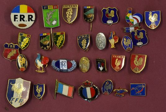 France and Romania Rugby Union Pin Badge selection of various enamel pin badges, various shapes and sizes, with the French Cock emblem displayed on most, 9 x Romania pin badge generally good clean condition (#30)